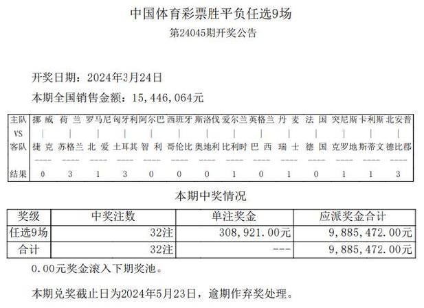 北京时间4月25日,胜负彩第25064期任九开奖结果揭晓。本期任九开出8588注,单注奖金1331元。本期任九投注总额为17,867,186元。