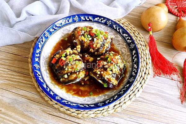 20049浏览 / 58收藏 健康功效 猪肉:润燥 鸡蛋:润燥 姜:散寒解表 食材用料 小米椒 一个 长茄子 一个 盐 1克 生抽 5克 老抽 2克 灯笼茄子的做法1.猪肉加葱姜剁成肉馅,放入鸡蛋,淀粉,盐,生抽,蚝油,盐,胡椒粉,花生油2.顺一个方向搅拌上劲3.茄子洗净,用中间差不多粗细的部位,切成4厘米左右的段,底部切平,方便后面摆拍,大蒜切沫,小米椒切圈,这一步忘记拍了4.中间切连刀,底部不要切断5.放入肉馅,摆入盘中6.蒸锅加水烧开,放入茄子,大火蒸15分钟左右7.将茄子盘底的汤汁放入碗中,加入适量淀粉,老抽,糖,生抽,搅拌均匀8.倒入锅中煮开9.煮至汤汁粘稠,放入蒜末和小米圈,...