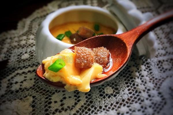 262322浏览 / 172收藏 健康功效 鸡蛋:润燥 食材用料 泡发好的海参 一个 生抽 二茶匙 温开水 八十五克 香葱碎 一小撮 海参鸡蛋羹的做法1.食材提前准备好,海参要提前浸泡炖煮。2.鸡蛋打撒,加入温开水拌匀。3.搅拌好的蛋液过筛,去掉大泡及蛋白沉着物,要想蛋羹细嫩爽滑,这一步不可省略哦!4.泡发好的海参,切成小丁。5.加入过好晒的蛋液中,稍稍搅拌均匀。6.蛋盅覆盖保鲜膜,用叉子扎几个透气孔,冷水入蒸屉,上汽后蒸十分钟,即可。7.出锅的蛋羹打花刀,这一步是为了让酱汁能均匀的渗透。8.淋上酱汁即可食用。9.海参鸡蛋羹可以为爱美的你及身体虚弱的人群,在下午茶时补充养分,给女性朋友补...