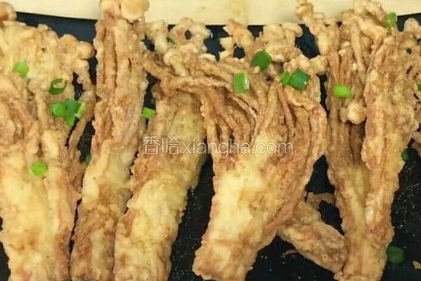 28034浏览 / 80收藏 健康功效 金针菇:活血化瘀 鸡蛋:润燥 食材用料 盐 3克 小鲜葱 5克 油炸金针菇的做法1.鸡蛋打散2.金针菇洗净撕小把把3.鸡蛋液淋在上面4.面粉加五香粉调均匀5.把金针菇裹上干粉6.裹成这样7.锅中烧油六成热8.金针菇下锅不停翻9.炸至微黄捞出控油10.趁热撒上孜然粉椒盐小香葱酥脆味美 本菜谱由上传...