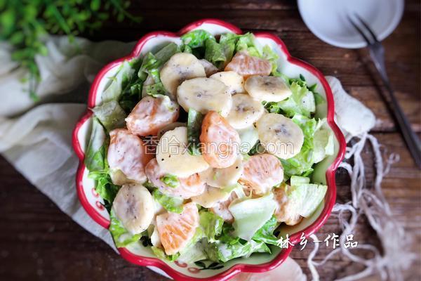 13604浏览 / 38收藏 健康功效 香蕉:活血化瘀 生菜:活血化瘀 食材用料 芦柑 1个 沙拉酱 1包(30克) 沙拉汁 1小包 水果创意菜+家常水果沙拉的做法1.生菜摘洗干净2.切碎,装入容器中3.香蕉去皮,切片4.放入生菜上面5.芦柑去皮,在中间切开6.放入香蕉上面7.挤入沙拉汁和沙拉酱8.拌匀,上桌即可食用9.成品图 小贴士做沙拉只要用自己喜欢的水果和蔬菜就会很好吃哟。还可以加入玉米粒和青豆等,不过需要先焯水煮熟后过凉开水浸泡至凉。 本菜谱由上传...