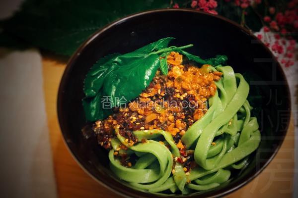 16779浏览 / 26收藏 食材用料 (制桑叶汁)桑叶 50克 (制桑叶汁)温水 50克 (和面)桑叶汁 130毫升 (和面)中筋面粉 300克 (和面)盐 3克 桑叶手擀面的做法1.准备主要食材。2.锅中烧水,水开后放入1小勺盐(配料表外)。3.放入洗净的桑叶焯水1-2分钟。4.捞出投入凉水中过凉。5.和温水一起放入破壁机料理杯中。6.搅打成细腻的桑叶汁。7.面粉加盐和桑叶汁搅成粗絮状。8.揉成团。9.用保鲜袋封好放置。10.每隔20分钟左右可以直接隔着保鲜袋揉2分钟。11.约2小时左右将面团拿出,案板上洒些干粉。12.用擀面杖擀成薄片。13.卷成圆筒状。14.切成自己喜欢的粗细。1...