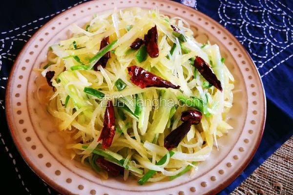 9732浏览 / 19收藏 健康功效 土豆:活血化瘀 蒜苗:活血化瘀 白糖:活血化瘀 食材用料 树椒 5个 盐 少许 鸡粉 少许 树椒土豆丝的做法1.准备食材。2.土豆切丝,蒜苗切小段,树椒斜着剪小段。3.土豆丝用清水投几遍,去除淀粉,捞出控水。4.锅内放油,油温热放入花椒煸出香味撇出去。5.放入树椒煸成稍有一点焦糊状,再放入葱花。6.放入土豆丝,加少许白糖,白醋,盐大火翻炒。7.放入蒜苗,鸡粉,翻炒均匀即可关火。8.盛盘。 小贴士炒树椒土豆丝要用大火快炒,少加点醋,断生即可。 本菜谱由上传...