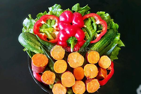 73134浏览 / 25收藏 健康功效 生菜:活血化瘀 黄瓜:活血化瘀 红薯:补中益气 食材用料 水果红椒 1个 秋葵 300克 时蔬大拼盘的做法1.准备食材:生菜一把,红薯3根,秋葵300克,水果红椒1个,黄瓜2根。2.红薯洗干净,切段。3.上蒸屉蒸10分钟。4.蒸红薯的期间清洗干净秋葵。5.待红薯蒸10分钟后放入秋葵,继续蒸。6.蒸秋葵期间,生菜清洗干净,控水备用。7.生菜控水期间,水果红椒清洗干净。8.黄瓜清洗干净。9.切成圈备用。10.找个大点的容器,放入控水的生菜。11.再放入黄瓜。12.切好的水果红椒备用。13.十分钟到,用筷子轻易扎透,红薯熟了。14.放入蒸熟的秋葵。15....