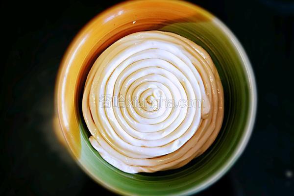 16901浏览 / 57收藏 食材用料 盐 1勺(调料勺) 水 1碗(4寸) 拉条子盘面的做法1.三勺普通面粉。2.1/2勺盐,盐不能太多,太多了不好撑开。3.4寸碗的水一碗(因为面粉吸水性不一样,仅供参考)。4.拌成絮状。5.揉成不沾手的面团,面团稍软一些。松弛30分钟。6.30分钟到,再揉一遍,揉至光滑。7.台面刷油放入面团,防粘。8.再给面团表面刷少许油。9.盖保鲜膜再松弛30分钟。10.这是前后加起来松弛了1个小时后的面团。11.不用揉,直接切成粗条。12.用手抓一下,延展性已经非常好了。很容易撑开。13.搓成均匀粗细的长条。14.容器里刷油。15.盘他,盘它,盘它。16.盘好的...