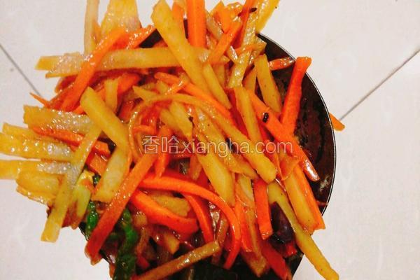 6809浏览 / 11收藏 健康功效 土豆:活血化瘀 红萝卜:活血化瘀 酱油:活血化瘀 食材用料 盐 适量 辣椒粉 适量 手残党必学的 爆炒红萝卜土豆丝的做法1.葱段 辣椒段 准备2.土豆 红萝卜切丝准备(先切片后改刀切丝)3.填油,起锅开炒,依次放入食材,葱辣椒炒出香味后放入红萝卜及土豆丝,翻炒均匀,待快熟时加入辅料 盐,酱油 ,尝味(依个人口味可适当加入辣椒粉)4.最后加入味精综合调味,起锅盛盘开吃啦~ 小贴士土豆中含有淀粉,所以炒菜途中可适当加水,以免黏锅 本菜谱由上传...