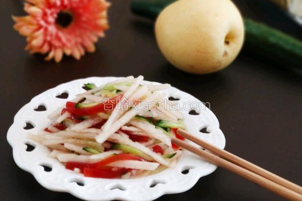 71981浏览 / 41收藏 健康功效 黄瓜:活血化瘀 白糖:活血化瘀 食材用料 白梨 1个 山楂糕 100克 盐 少许 拌果蔬三丝的做法1.黄瓜切粗丝。2.加少许盐腌10分钟,挤干水分。3.山楂糕切粗丝。白梨洗净去皮,切粗丝。4.将三种食材装入大碗中,加白糖、白醋轻轻搅拌均匀。5.装盘。 小贴士山楂糕也可以换成果丹皮。白梨最后切丝,防止氧化变色。 本菜谱由上传...