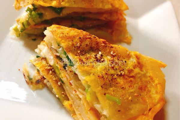 29206浏览 / 101收藏 食材用料 手抓饼皮 5张 盐 一勺 椒盐 5克 辣椒粉 不吃辣可以不要 手抓葱饼的做法1.首先,手抓饼皮水沸腾后蒸5分钟2.小葱切丁放油放盐搅拌均匀腌制5分钟,鸡蛋打散3.饼皮层次叠加,每层刷葱油4.放平底锅小火煎制两面金黄,一定要小火哦5.选择一面均匀涂抹鸡蛋液,洒上胡椒粉辣椒粉调味,洒上芝麻点缀即可6.选择自己喜欢的形状切开摆盘,完成啦 本菜谱由上传...