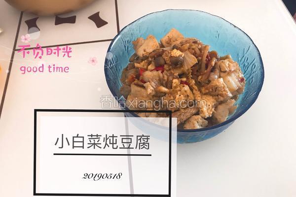 5812浏览 / 11收藏 健康功效 酱油:活血化瘀 食材用料 大豆腐 半块 盐 酌情 13香 少量 小米辣 五个 小白菜炖豆腐的做法1.将豆腐切成小块,放入碗中;将娃娃菜切成小块,放入碗中备用;将姜蒜切成小块放入碗中备用;将肉切成条状放入碗中加入料酒和13香腌制10分钟放入碗中备用;将红辣椒切成小块放入碗中备用;将蘑菇洗干净,放入碗中备用。2.翻炒:起锅烧油 油热将切好的肉放入锅中,翻炒再加入姜蒜辣椒翻炒爆香,当肉炒成白色时加入娃娃菜和蘑菇翻炒2分钟。在加入豆腐,轻轻翻炒再加入酱油,豆瓣酱和1少量食盐翻炒2分钟,再加入一些小碗水3.中火炖到汤汁变少 盛出。 小贴士  豆腐下锅前,先在开...