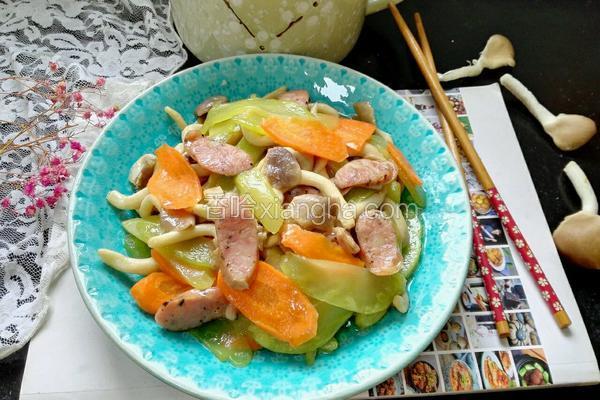 9595浏览 / 17收藏 健康功效 香肠:促进生长、发育、增强免疫力、护肤 胡萝卜:活血化瘀 食材用料 秀珍菇 100g 盐 一勺 生抽 一勺 小炒莴苣的做法1.秀珍菇清洗干净备用2.莴苣切成片焯下水3.锅内放油烧热将香肠煎一下4.放入秀珍菇一同翻炒然后再加入莴苣5.加入一勺盐调味6.加入一勺生抽提味7.最后加入胡萝卜翻炒均匀入味即可出锅8.装盘拍上成品图,一道美味又营养的小炒莴苣就完成了。 本菜谱由上传...