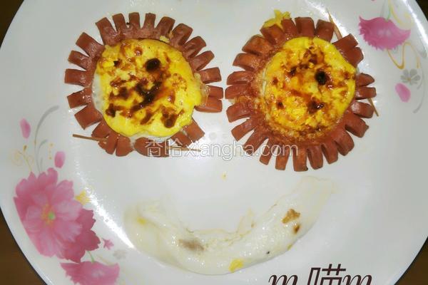 8870浏览 / 14收藏 健康功效 鸡蛋:润燥 食材用料 火腿肠 1 酱料 适量 太阳蛋的做法1.锅里放适量水煮开,火腿对半切开,放锅里煮两分钟捞起。拿一双筷子,把火腿放中间切成下图的样子,然后把火腿圈个圈,用牙签固定。2.起油锅,放入火腿圈,蛋清蛋黄分开(蛋白不要浪费,可以煎了吃),将蛋 黄放进火腿圈,煎至定型之后翻面。3.最后刷上自己喜欢的酱料(我刷的是黄豆酱) 小贴士火腿一定要煮过,不然圈不了,会断,还有要趁热圈。 本菜谱由上传...