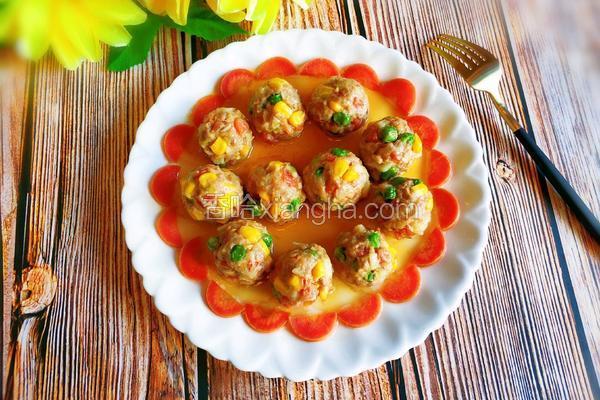 18064浏览 / 433收藏 健康功效 胡萝卜:活血化瘀 胡椒粉:补血、护齿、保护骨骼 食材用料 玉米粒 100克 猪肉沫 300克 盐 一勺 生抽 两勺 多彩肉丸的做法1.成品图2.准备好的肉沫。3.所需食材,胡萝卜切丁。4.肉沫里调入上述调味料拌匀腌制十分钟入味。5.水开将胡萝卜,玉米粒,豌豆焯水。6.控干水份到入调好的肉沫里。7.搅拌均匀。8.做成大小相同的肉丸。9.做好之后上锅蒸十五分钟。10.蒸好取出,胡萝卜做围边,这道美味就完成了。11.味道超赞,蒸出的汤汁泡饭也特别好吃。 小贴士也可以换成自己喜欢的菜一起蒸。做肉丸时摔打几下肉馅,这样做出的肉丸Q弹很好吃。肉馅里味道已经调...