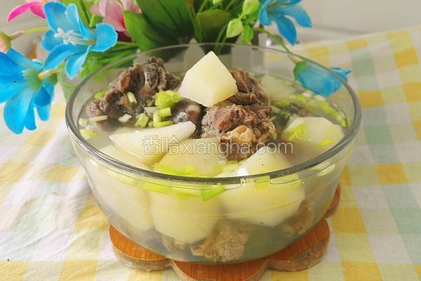 31055浏览 / 103收藏 健康功效 牛肉:补脾胃、强筋骨、益气血 土豆:活血化瘀 食材用料 盐 适量 水 适量 土豆牛骨汤的做法1.准备好食材2.在汤锅中倒入适量水,拍入一块姜3.另一锅中烧开水,将洗净的牛骨焯一下4.将焯好的牛骨头倒入汤锅中,小火慢熬5.把土豆削皮切成滚刀状,泡于水中6.将葱洗净切成葱花7.90分钟后倒入土豆8.30分钟后加入适量盐9.5分钟后倒入葱花,即可关火10.盛入碗中11.土豆牛骨头就制作好了~12.成品图 小贴士1、将削好的土豆泡于水中,可避免氧化 2、煮汤的过程准备菜,可以节约时间 本菜谱由上传...