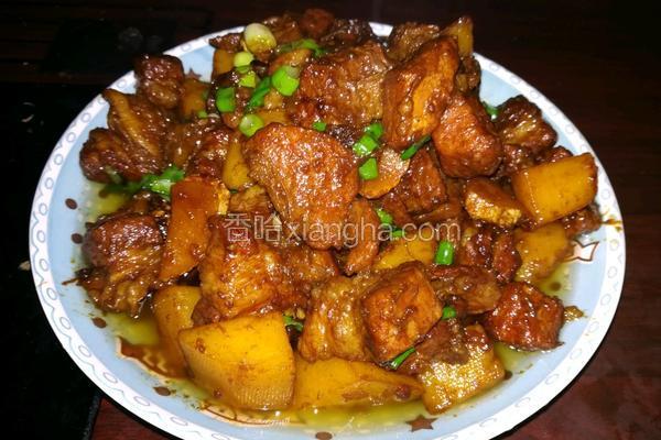 18554浏览 / 74收藏 健康功效 土豆:活血化瘀 五花肉:润燥 八角:理气、止痛、散寒 食材用料 香叶 适量 盐 适量 土豆红烧肉的做法1.五花肉切小块,用水焯一下,葱姜蒜辣椒切小段2.起锅烧油,加白砂糖,炒糖色,下五花肉上色3.加葱姜大料,翻炒,加料酒酱油继续翻炒4.加盐,加热水,小火四十分钟,加土豆,大火再炖十五分钟,收汁 小贴士少放油,五花肉出油 本菜谱由上传...
