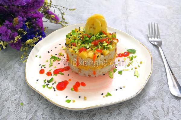 99161浏览 / 84收藏 健康功效 香蕉:活血化瘀 食材用料 熟杂粮饭 120克 熟黑芝麻 2克 即时脆秋葵 1根 香蕉肉松饭团的做法1.把所有食材,都准备好2.香蕉剥皮切丁,少许切片,备用3.把脆秋葵,切成碎沫,备用4.杂粮饭里面,倒入苹果醋,搅拌均匀5.准备好一个,自己喜欢的模具6.最底下的一层,放杂粮饭,压实7.然后把肉松,放杂粮饭上面,铺均匀8.肉松铺好,再放一层杂粮饭,压实9.饭团的最上面,铺上一层香蕉丁10.把模具移到盘子中,脱模11.脱模的饭团,洒上秋葵碎和黑芝麻12.最后点缀上香蕉片,挤上番茄酱13.美味可口的香蕉肉松饭团,做好啦 本菜谱由上传...
