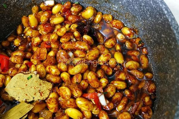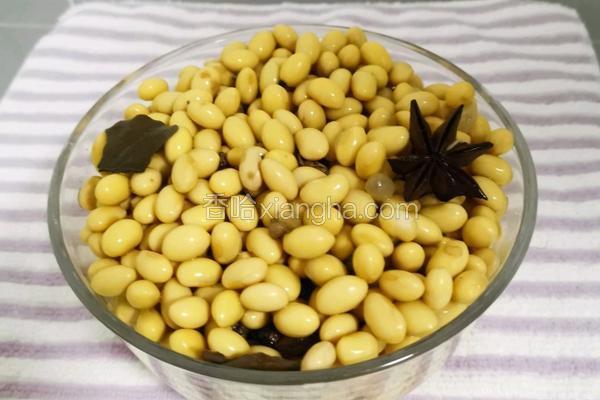 11325浏览 / 12收藏 健康功效 黄豆:导滞 八角:理气、止痛、散寒 食材用料 水 适量 花椒颗粒 10粒 香叶 3片 五香黄豆的做法1.黄豆泡水一夜,半碗黄豆。2.一夜之后,黄豆泡发,膨胀了……半碗黄豆胀满一碗。3.换水,沥干水分。4.清晨,加水,花椒颗粒,香叶,八角,盐……5.大火烧开,转小火6.加葱两根,葱段若干。掠去浮沫。7.煮了40分钟的豆子,关火,盖盖继续焖,自然放凉,去掉汤水。8.豆子的香味飘散开来,好香啊!一吃一勺,一吃一把,五香豆! 小贴士看似简单的水煮黄豆,火候掌握很重要。豆子不能太硬,也不能煮过火,太软太绵都不好吃。就是要豆子不硬也不软,秘制五香豆,吃个脆脆爽...