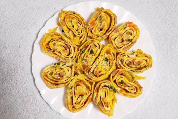 9217浏览 / 23收藏 健康功效 鸡蛋:润燥 胡萝卜:活血化瘀 玉米:活血化瘀 食材用料 盐 3克 五彩鸡蛋卷的做法1.玉米粒、葱、胡萝卜、土豆、、火腿切丁备用【五彩】2.打入4个鸡蛋3.放入淀粉,盐,少许白糖4.搅散5.呈蛋液状即可6.电磁炉开小火,倒入适量油到平底锅中,待平底锅热了之后7.倒入搅拌均匀的蛋液,晃动下平底锅,使蛋液均匀分开8.卷起9.再倒入蛋液,晃动下平底锅,使蛋液均匀摊开10.再卷起11.再倒入剩下的蛋液,晃动下平底锅,再卷起12.好嘞13.将鸡蛋卷拿在砧板上14.再切块15.色香诱人~16.五彩鸡蛋卷 小贴士1⃣在煎制的时候不可以用大火,因为会烧焦掉噢,得用小火...
