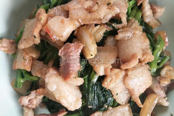 9000浏览 / 11收藏 健康功效 五花肉:润燥 空心菜:活血化瘀 食材用料 盐 适量 生抽 适量 蒜米 适量 五花肉炒空心菜的做法1.准备好空心菜,洗干净2.肉用料酒腌一下3.五花肉炒出些许油,吃的时候不会太腻4.炒空心菜5.把肉、蒜米放下去一起炒6.加适量盐,生抽上色7.装盘 本菜谱由上传...