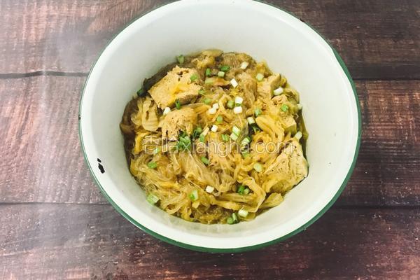 9609浏览 / 25收藏 健康功效 五花肉:润燥 食材用料 冻豆腐 200g 酸菜 250g 盐 4g 生抽 5g 葱花 20g 酸菜粉丝冻豆腐的做法1.准备材料2.冻豆腐焯水10分钟备用3.酸菜焯水2分种,备用4.炒出五花肉肥油5.下蒜片,葱段炒香6.下酸菜炒干7.加盐,生抽,蚝油,糖翻炒8.加冻豆腐和热水炖5分钟9.放入粉丝炖8分钟10.出锅撒葱花即可 小贴士冻豆腐冷水下锅 本菜谱由上传...