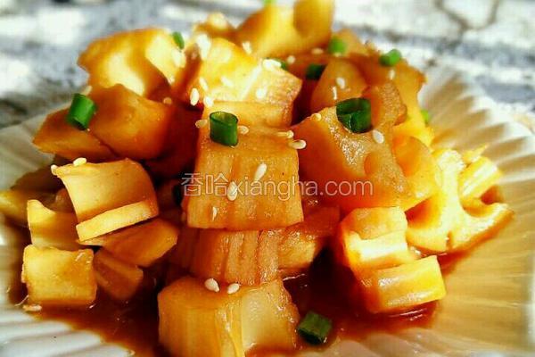 124798浏览 / 392收藏 食材用料 藕 一节 盐 一克 清水 少量 酸甜藕丁的做法1.莲藕去皮后切成1厘米左右的块,然后用水冲洗两遍。2.把藕丁放水里煮一到两分钟。然后用水冲洗至凉透,捞出沥水。3.醋二勺,糖三勺,生抽二勺,蚝油二勺,盐少许,加一点水调成汁待用。4.锅里放油,油热后倒入藕丁翻炒,5.加入糖醋汁小火熬煮一下更入味,倒入淀粉水收汁盛出。6.最后撒上熟芝麻和葱花。7.成品图。8.成品图。 小贴士戚加入糖醋汁时小火熬煮一下更入味的。 本菜谱由上传...