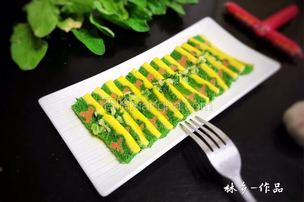 597310浏览 / 249收藏 健康功效 鸡蛋:润燥 食材用料 菠菜泥 60克 盐 少许 葱花 适量 蒜末 适量 蒸花蛋的做法1.火腿肠去皮,切成自己喜欢的形状2.菠菜泥中加入鸡蛋白和盐,搅打至蛋白起泡3.盘底铺好保鲜膜4.倒入一半的菠菜蛋白泥,放入火腿肠5.再倒入剩下的一半菠菜蛋白泥6.同冷水一起下锅,烧开后蒸3分钟7.备好蒜末和葱花8.把油烧至冒烟,倒入蒜末和葱花里,备用9.把鸡蛋黄划散,倒入蒸好的菠菜蛋白泥上面10.再盖上保鲜膜,中火继续蒸3分钟11.起锅后拿去保鲜膜12.放入砧板上,把周边切整齐13.再切片,摆入盘中14.成品图15.再来一盘 小贴士蒸鸡蛋冷水下锅,蒸出来的鸡蛋...