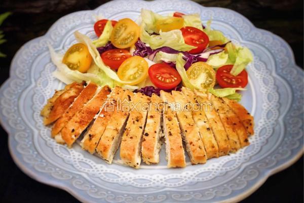 230419浏览 / 1235收藏 健康功效 蜂蜜:活血化瘀 食材用料 鸡胸肉 1块 橄榄油 10毫升 盐 适量 黑胡椒粉 适量 生食水果蔬菜 随意 蒜香烤鸡胸肉的做法1.主要食材。鸡胸肉洗净用厨房纸吸干水分。2.双面洒上黑胡椒粉和盐抹匀腌制十分钟左右。3.蒜压成泥和橄榄油混合。4.加入蜂蜜。5.顺同一方向搅拌至完全融合。6.将鸡胸肉移至锡纸上。7.双面浇上调好的蒜油汁。8.密封包好放入冰箱冷藏过夜。9.烤箱230度上下火预热好,放入鸡胸肉(无需打开锡纸)。10.烤30分钟左右,打开锡纸继续烤5分钟让其表面上色。11.放熟食板晾凉。12.切块,配上水果蔬菜即可。 小贴士没有烤箱也可以用平...