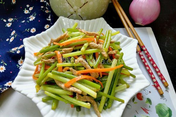 12020浏览 / 57收藏 健康功效 蒜薹:活血化瘀 胡萝卜:活血化瘀 食材用料 瘦肉 100g 盐 一勺 生抽 一勺 蒜薹炒肉丝的做法1.将肉洗净切成肉丝用盐、生抽、黄酒、葱腌制十五分钟2.胡萝卜切成丝备用3.蒜苗洗净切成小段放入锅内焯水4.锅内放油烧热放入肉丝翻炒5.炒致八分熟盛出备用6.将蒜薹和胡萝卜丝放入锅内一同翻炒7.炒一会之后放入肉丝,加一小勺盐调味8.加一勺生抽提鲜9.快速翻炒入味即可出锅10.装盘拍上成品图,一道美味又清甜的蒜薹炒肉丝就完成了 本菜谱由上传...