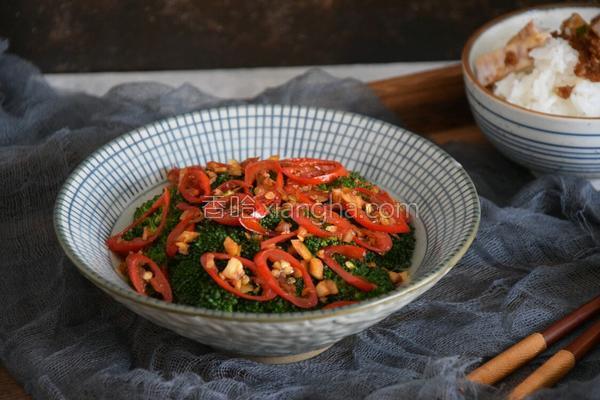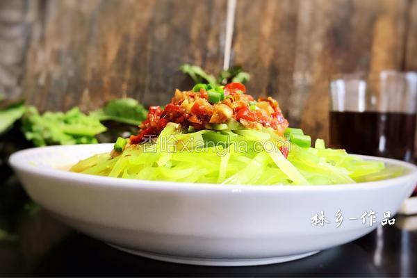 6744浏览 / 23收藏 健康功效 莴笋:活血化瘀 食材用料 生抽 少许 自制蒜蓉剁椒 适量 葱花 适量 蒜蓉辣椒酱翡翠丝的做法1.莴笋去皮洗净,切丝2.再清洗干净3.沥水后装入盘中4.放入开水锅中,蒸3分钟5.备好葱花6.蒜蓉剁椒放入碗中,加入少许生抽拌匀7.取出蒸好的莴笋,把汤汁沥入蒜蓉剁椒里,拌匀8.加入香油拌匀9.倒入莴笋丝上面10.撒上葱花即可11.成品图 小贴士莴笋的形状随自己喜好切,上锅蒸的时间也随莴笋的形状大小来定。切小点蒸的时间短点口感更好。 本菜谱由上传...