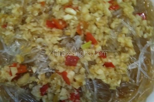 14868浏览 / 20收藏 健康功效 鲍鱼:补虚 粉丝:活血化瘀 金针菇:活血化瘀 食材用料 剁椒 若干 葱姜 适量 蒜蓉粉丝蒸鲍鱼的做法1.将鲍鱼切成薄片。2.将金针菇清洗干净,铺在盘底。并将鲍鱼片和少许葱姜放在上面。3.泡好粉丝。4.将蒜切成蒜蓉,并放上少许剁椒,胡椒粉,酱油。5.将泡好的粉丝放在鲍鱼上,在淋上调好的酱汁,大火蒸十分钟。6.美味的蒜蓉粉丝蒸鲍鱼就做好了。 本菜谱由上传...
