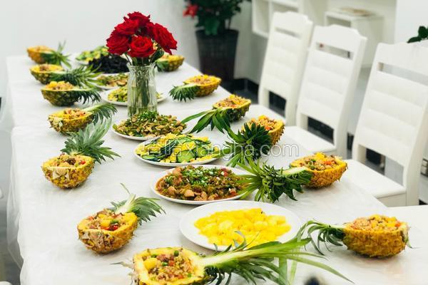 4854浏览 / 12收藏 健康功效 青豆:润燥 胡萝卜:活血化瘀 虾:增强免疫力、抗氧化、护眼明目 食材用料 菠箩 15 瘦肉 5斤 红色甜辣椒 2个 盐 适量 鸡精 小许 菠萝饭的做法1.选择新鲜的菠萝,不要熟透那种,会特别甜,口感没有那么好的2.菠萝切半分开,用小刀田字分隔3.用勺子挖菠萝肉出来,备用4.青豆,清洗,用热水烫半熟备用5.瘦肉,切丁,适量放盐,酱油腌好备用,不要放太咸6.胡萝卜切丁,腊肠切丁,备用7.1.瘦肉,大火放肉开炒,焖熟。装好备用8.2.将胡萝卜,青豆,腊肠,全放锅大火炒3分钟放盐,适量鸡精炒2分钟后,加大米,加适量的酱油,再炒10分钟,放红辣椒炒1分钟,再放...