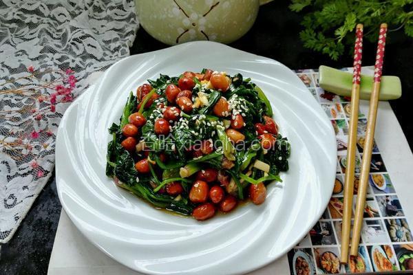 83605浏览 / 422收藏 健康功效 菠菜:平肝 花生:化痰 白糖:活血化瘀 食材用料 白芝麻 一小把 大蒜头 两瓣 盐 少许 生抽 适量 菠菜拌花生米的做法1.热锅冷油开始炒花生2.小火慢炒炒致花生熟即可出锅晾凉3.菠菜洗干净切成均匀的段4.准备拌菠菜的调料:蒜末、蚝油、生抽、白糖、油各适量5.将菠菜焯下水放入一勺盐,可以使菠菜更翠绿6.菠菜挤干水分放入盘内7.放入之前炒好的花生和适量白芝麻搅拌均匀即可8.拍上成品图,一道爽口又美味的菠菜拌花生米就完成了 本菜谱由上传...