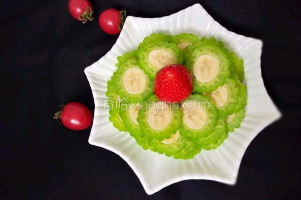 133070浏览 / 107收藏 健康功效 苦瓜:活血化瘀 香蕉:活血化瘀 食材用料 盐 适量 苦瓜酿香蕉的做法1.苦瓜洗净,去头去蒂后,从中间一切两半。2.用筷子或者小勺子,将瓜瓤挖出。3.锅中加少许盐将水煮沸后,把苦瓜倒入煮1—2分钟。4.苦瓜烫好后从锅中捞出过凉水。5.过凉后捞出,轻轻挤净多余水分,香蕉去皮塞进苦瓜中。6.切成薄片。7.浇上蜂蜜,摆盘即可食用。 本菜谱由上传...