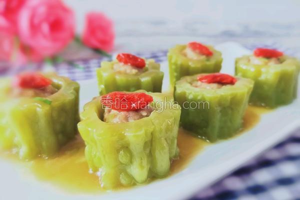 772591浏览 / 176收藏 健康功效 苦瓜:活血化瘀 食材用料 肉馅 70克 味极鲜酱油 0.5勺 盐 适量 鸡精 适量 苦瓜酿肉的做法1.成品图。2.准备调好的肉馅,苦瓜切段,挖去瓤。3.再将肉馅塞入苦瓜中。4.锅中烧水,大火蒸10分钟。5.时间到,取出摆盘。6.将多余的汤汁倒入锅里,加入料酒,味极鲜酱油,盐,鸡精烧开,淋入水淀粉勾芡。7.最后把芡汁浇在苦瓜上,用泡好的枸杞装饰即可。 小贴士枸杞提前用清水泡10分钟左右。 本菜谱由上传...