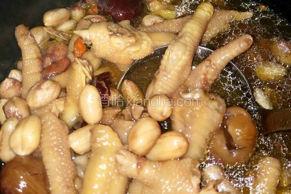10998浏览 / 22收藏 健康功效 花生:化痰 花生油:抗氧化、抗癌防癌、促进生育 食材用料 龙眼干 适量 姜片 4片 盐 适量 花生煲鸡爪的做法1.菜市场买好鸡爪清洗备用2.放料酒姜块焯水十分钟左右3.捞出晾干水份4.把材料准备好一起下锅煲5.放适量水,没过面就好6.锅里煲一个水时左右7.放盐乘出,就可以吃到美味了 本菜谱由上传...