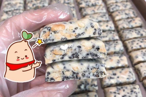 117890浏览 / 121收藏 健康功效 黄油:活血化瘀 食材用料 棉花糖 450克 碎花生 300克 熟黑芝麻 100克 全脂奶粉 200克 海盐 1克 花生芝麻牛轧糖的做法1.提前准备好所有材料,无糖全脂奶粉过筛,芝麻花生混合均匀备用,用不粘锅全程小火。2.明火开最小火,不粘锅放入黄油。3.搅拌至完全融化4.加入棉花糖5.棉花糖搅拌至完全融化,加入奶粉。6.搅拌混合均匀7.关火,倒入芝麻花生。8.用刮刀混合翻拌均匀9.熬好的牛轧糖挪至不沾烤盘揉几下。趁热借助擀面杖压板塑型,按压时记得垫上张油纸。10.趁热借助擀面杖压板塑型,按压时记得垫上张油纸。11.冷却的牛轧糖切成自己喜欢的大小...