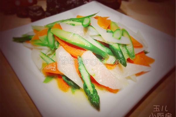 14800浏览 / 89收藏 健康功效 芦笋:活血化瘀 胡萝卜:活血化瘀 山药:活血化瘀 食材用料 盐 2克 芦笋胡萝卜炒山药的做法1.准备主要食材:胡萝卜、山药去皮,芦笋去老梗并削去老皮。2.山药、胡萝卜和芦笋均切成片备用。3.锅里烧水,水开后放少许盐和油(配料表用量外)。4.放入所有的菜焯水。5.断生后投入凉水或者冰水中。6.锅洗净,烧热放油。7.放入山药、胡萝卜、芦笋片翻炒。8.调入盐、白糖。9.起锅装盘即可。 小贴士1、三种蔬菜的比例基本保持为1:1:1。2、焯水时先放点油和盐,让菜的色彩更加鲜艳。 本菜谱由上传...
