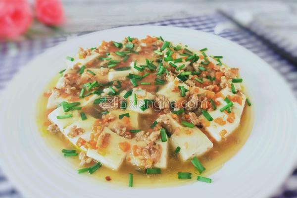 357693浏览 / 360收藏 健康功效 豆腐:润燥 胡萝卜:活血化瘀 食材用料 肉馅 30克 葱花 3克 味极鲜酱油 0.5勺 盐 适量 鸡精 适量 植物油 适量 肉末蒸豆腐的做法1.成品图。2.豆腐切小块,摆盘子里。3.准备肉馅,切葱花,胡萝卜丁。4.锅倒油烧热,放入肉馅,胡萝卜丁翻炒断生。5.将炒好的肉末铺在豆腐表面。6.锅水烧开,放入豆腐大火蒸8分钟。7.时间到,取出豆腐盘把多余汤汁倒入锅中,调入料酒,味极鲜酱油,盐,鸡精,葱花烧开,水淀粉勾芡。8.将芡汁浇在豆腐表面。9.最后撒上葱花即可。 本菜谱由上传...