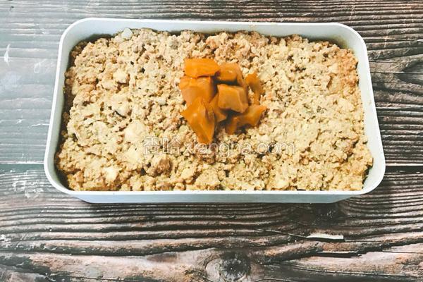 148434浏览 / 59收藏 健康功效 鸡蛋:润燥 豆腐:润燥 料酒:活血化瘀 食材用料 榨菜 20g 肉馅 100g 葱花 适量 盐 1勺 生抽 1勺 老抽 0.5勺 香油(淋) 1勺 肉末榨菜蒸豆腐卧蛋的做法1.豆腐切块泡盐水10分钟后,捞出摆在盘底2.切葱花和榨菜碎3.热锅冷油,待油微热下肉馅4.加料酒炒香5.待肉变色后加入葱花和榨菜碎,加盐,生抽,老抽,蚝油调味6.倒入豆腐中7.打入两个鸡蛋,蒸10分钟即可8.出锅撒葱花,淋香油即可 小贴士一般蒸8-10分钟是溏心蛋,不喜欢吃的朋友可以蒸13-15分钟就好了 本菜谱由上传...
