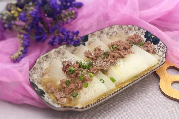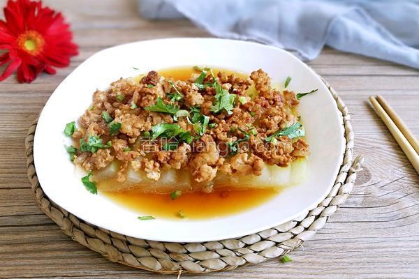 432369浏览 / 200收藏 健康功效 冬瓜:活血化瘀 猪肉:润燥 食材用料 葱姜 少许 生抽 一汤匙 盐 适量 肉末冬瓜的做法1.冬瓜去皮洗净切片,放入盘中2.猪肉加葱姜剁成肉末3.锅中加少许油,放入肉末炒至肉末变色4.放入生抽,盐,胡椒粉调味,炒匀即可关火5.将炒好的肉末铺到冬瓜上6.放入蒸锅中,上汽后蒸10分钟即可7.一道美味的肉末冬瓜就做好了! 本菜谱由上传...