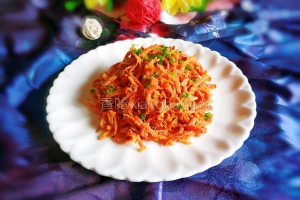 368881浏览 / 334收藏 健康功效 胡萝卜:活血化瘀 食材用料 盐 一勺 蒜沫 适量 粉蒸胡萝卜丝的做法1.成品图2.胡萝卜洗净切丝。3.放一勺盐腌制十分钟。4.去除多余水份。5.放适量面粉。6.将胡萝卜丝和面粉拌匀,每个都裹上面粉。7.上锅蒸十分钟。8.蒸好取出撒上蒜沫。9.浇上调好的料汁。10.拌匀即可11.撒上葱花,美味的胡萝卜丝就可以享用了。 小贴士要保持胡萝卜丝干爽,水份挤干,这样吃起来口感有韧劲。口味可以根据自己适量调节。 本菜谱由上传...