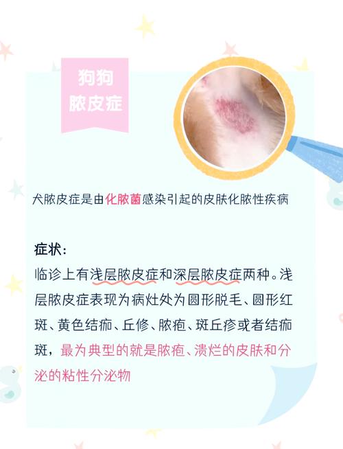 不同皮肤病类型的用药方案不同,建议及时带去医院进行皮检后确定最佳治疗方案,以下是几种常见的皮肤病用药方案:1、细菌性皮肤病:涂抹碘伏或双氧水,干燥后涂抹一层抑菌消炎软膏或喷剂,口服抗生素预防感染。2、真菌感染:患处使用皮普特清洗掉皮屑,再涂抹一层含有复方酮康唑、盐酸特比萘芬等成分的抗真菌药,严重犬只遵循医嘱口服伊曲康唑片。3、螨虫感染:常见的螨虫感染分为疥螨、蠕形螨、耳螨等。一般需要使用吡虫莫昔克丁、氟雷拉纳、塞拉菌素、伊维菌素等成分的药进行外驱,并定期使用抗蠕虫和抑菌香波进行药浴。(图片来源网络,侵删)...