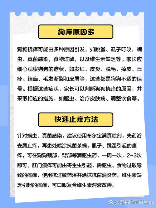 皮肤瘙痒可能是由于寄生虫感染、皮肤病、皮肤过敏引起的。(图片来源网络,侵删) 第一,要考虑是否体表存在寄生虫,比如跳蚤、虱子的叮咬会造成皮肤的瘙痒,需要使用体外滴剂; 第二,要考虑螨虫感染,比如蠕形螨、耳螨、疥螨,螨虫会引起狗狗的剧烈瘙痒,此时需要使用一些杀螨的药物或体外驱虫药; 第三,要考虑真菌或细菌的感染,的被毛皮肤可能会出现局部脱毛、红肿、结痂等,可以使用一些广谱的抑菌药物治疗; 第四,还要考虑过敏性皮、异位性皮炎,导致狗狗发生发生过敏性皮炎的原因很多,需及时排除过敏源并对症治疗。...