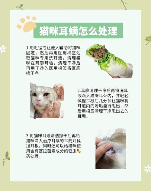 患有耳螨后,首先,先将猫咪隔离开,防止互相进一步传染。然后及时给猫咪戴上伊丽莎白圈,防止继续抓挠而继发感染。其次,需要使用猫咪专用洗耳液和耳螨药,每天进行外耳道和用药,连续使用3-4周,前一周可以保持每天1-2次的频率上药,分泌物逐渐减少后可以每周清理3-4次。掏耳朵时注意不要用棉签掏耳,这样容易将分泌物推得更深。另外,患有耳螨的猫咪需要注意工作。轻症1个月1次驱虫,重症可在医生指导下,先半个月进行1次驱虫,后续再进行调整。(图片来源网络,侵删)...
