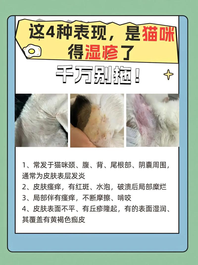 湿疹是猫咪比较常见的一种皮肤症状,湿疹是皮肤表皮细胞对过敏原引起的一种皮肤炎症的反应,主要形成机制是由于各种外界刺激软化了猫咪的皮肤角质层。例如机械刺激、自我啃咬、寄生虫叮咬、环境的潮湿闷热、汗液浸渍加上持续摩擦、刺激性药物及化学药品使用不当等都可能导致猫咪形成湿疹。通常皮肤敏感和抵抗力较差的猫咪更容易继发感染湿疹,所以营养失调、维生素缺乏、慢性以及内分泌功能紊乱可促使皮肤的抵抗力下降,导致患上湿疹。...