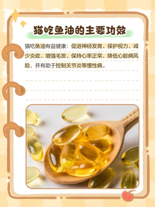 一般不建议给吃人吃的鱼油,因为人吃的鱼油和猫咪专用的鱼油的营养成分和剂量不一样。给猫咪少量饲喂人吃的鱼油一般不会对猫咪的健康造成影响,如果饲喂过多可能会对它们的肠胃造成较大的负担,引发健康问题。专用的鱼油中含有多种Omega-3脂肪酸和其他营养,具有美毛护肤的作用,适当地给猫咪饲喂一些宠物专用的鱼油,可以提高其皮肤的抵抗力和毛发的质量,有助于解决猫咪皮肤干燥、皮屑、脱毛、掉毛等问题,还可以修复其受损的皮肤细胞,促进皮肤的恢复。(图片来源网络,侵删)...