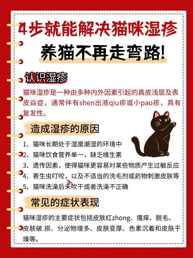 湿疹是猫咪比较常见的一种皮肤症状,湿疹是皮肤表皮细胞对过敏原引起的一种皮肤炎症的反应,主要形成机制是由于各种外界刺激软化了猫咪的皮肤角质层。例如机械刺激、自我啃咬、寄生虫叮咬、环境的潮湿闷热、汗液浸渍加上持续摩擦、刺激性药物及化学药品使用不当等都可能导致猫咪形成湿疹。通常皮肤敏感和抵抗力较差的猫咪更容易继发感染湿疹,所以营养失调、维生素缺乏、慢性以及内分泌功能紊乱可促使皮肤的抵抗力下降,导致患上湿疹。(图片来源网络,侵删)...