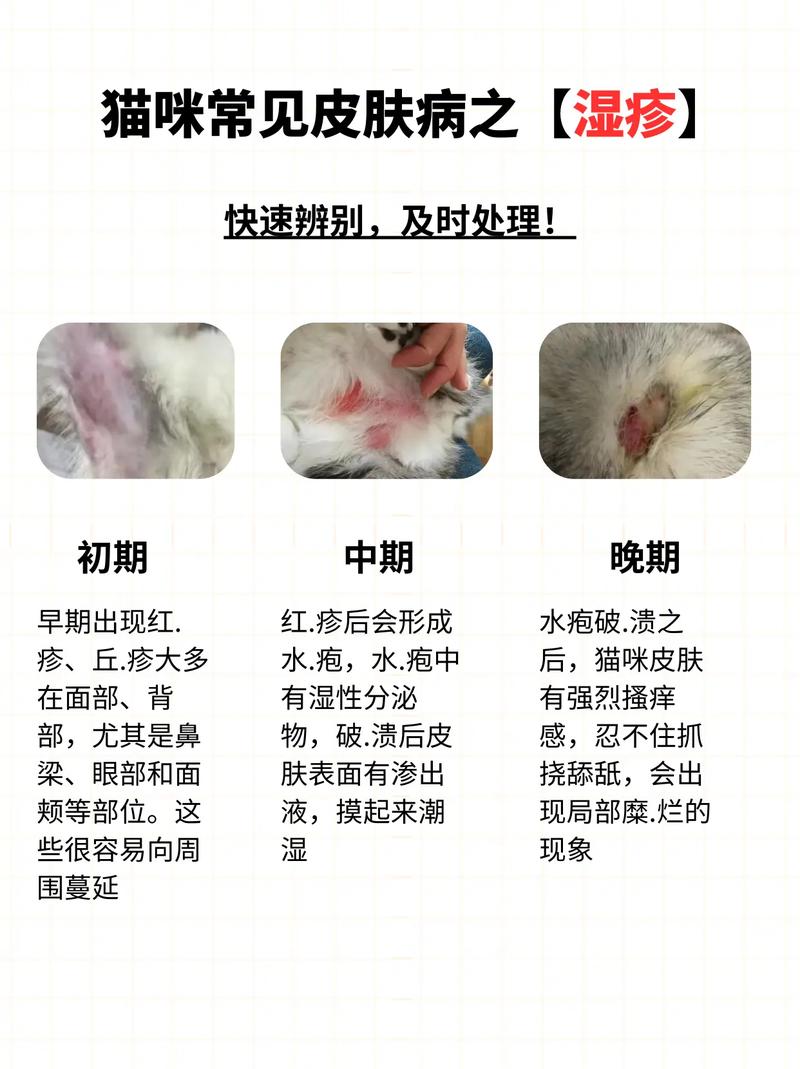 湿疹的临床症状分为急性湿疹和慢性湿疹两种情况。猫咪患有急性湿疹的症状主要表现为皮肤出现红疹和丘疹,病变部位大多在面部、背部,尤其是鼻梁、眼部和面颊等部位,而且容易向周围扩散,形成小水疱,水疱破溃后还会溃烂。而且因为皮肤瘙痒,猫咪会频繁地舔咬患部,导致症状加重。猫咪慢性湿疹的病程较长,临床症状通常表现为皮肤增厚、苔癣化、出现大片红疹和大量皮屑等。(图片来源网络,侵删)...
