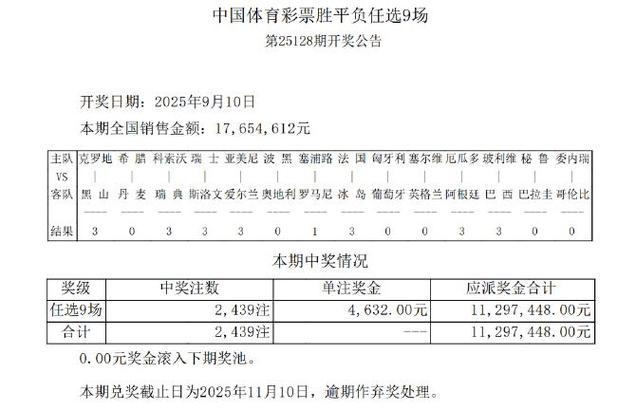 北京时间5月16日,足彩第25076期任九开奖结果揭晓。本期任九开出719注,单注奖金14,919元。本期任九投注总额为16,761,380元。   彩果方面:本期14场比赛中,仅打出6场首赔结果。西甲赛场,巴萨在加泰德比战客场2-0击败西班牙人,提前2轮收获本赛季西甲桂冠。此外,AC米兰0-1博洛尼亚、皇家社会0-1塞尔塔、奥萨苏纳2-0马竞、巴列卡诺2-2贝蒂斯、格罗宁根2-2阿贾克斯、佐加顿斯1-3米亚尔比、北雪平1-2代格福什、瓦纳默2-2马尔默,均打出3倍以上赛果。阿拉维斯、皇马、塞维利亚、巴萨、前进之鹰、埃尔夫斯均打出首赔。   胜   负   彩...