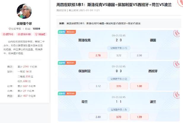 近日,世预赛火热进行中,在昨晚今晨的比赛中,德国客场0-2不敌斯洛伐克爆6倍大冷,荷兰1-1波兰也将近6倍,而且这两场比赛还都开售了竞彩单关玩法,两场大冷赛果杀得彩市一片哀嚎!   国际赛向来是大冷重灾区,充满着未知,不过冷门也并非无迹可寻,就在昨晚,多位专家稳稳拿下冷门,一起来看下![查看更多球通专家]   Winner球圣可是平台老专家了,也是捉冷能手,昨日他一单3串1,直接包揽德国、荷兰两场冷门以及西班牙客胜,可谓含金量十足!另外他在足球预测当中,近期也是7场命中6场,命中率绝对在线!而在比赛命中方面,他的世欧预也取得了4连红,长线8中7![最新方案]   皮哥懂个...