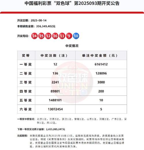 北京时间2025年8月14日,福彩双色球第25093期开奖,以下是详细开奖流程:   21:15 双色球摇奖开始   21:18 奖号全部产生,本期奖号红球09 11 12 24 25 26,蓝球10。   21:25 当期红球号码大小比为3:3,三区比为2:1:3,奇偶比为3:3。形态方面,红球开出1组2连号11 12和1组3连红24 25 26;2枚重号11 24;3枚斜连号12 24 25;蓝球开出遗漏44期的冷码10。   22:05 本期一等奖开出12注,单注奖金616万余元,12注头奖分落8地,其中江苏独中3注,河南、广东各中出2注,北京、浙江、安徽、山...
